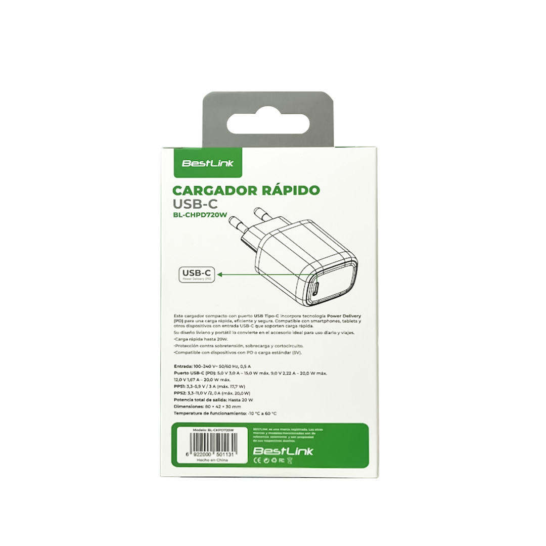 El Cargador Rápido USB-C Power Delivery 20W modelo: BL-CHPD720W está diseñado para ofrecer una carga eficiente, segura y de alto rendimiento mediante su puerto USB-C con tecnología Power Delivery (PD).