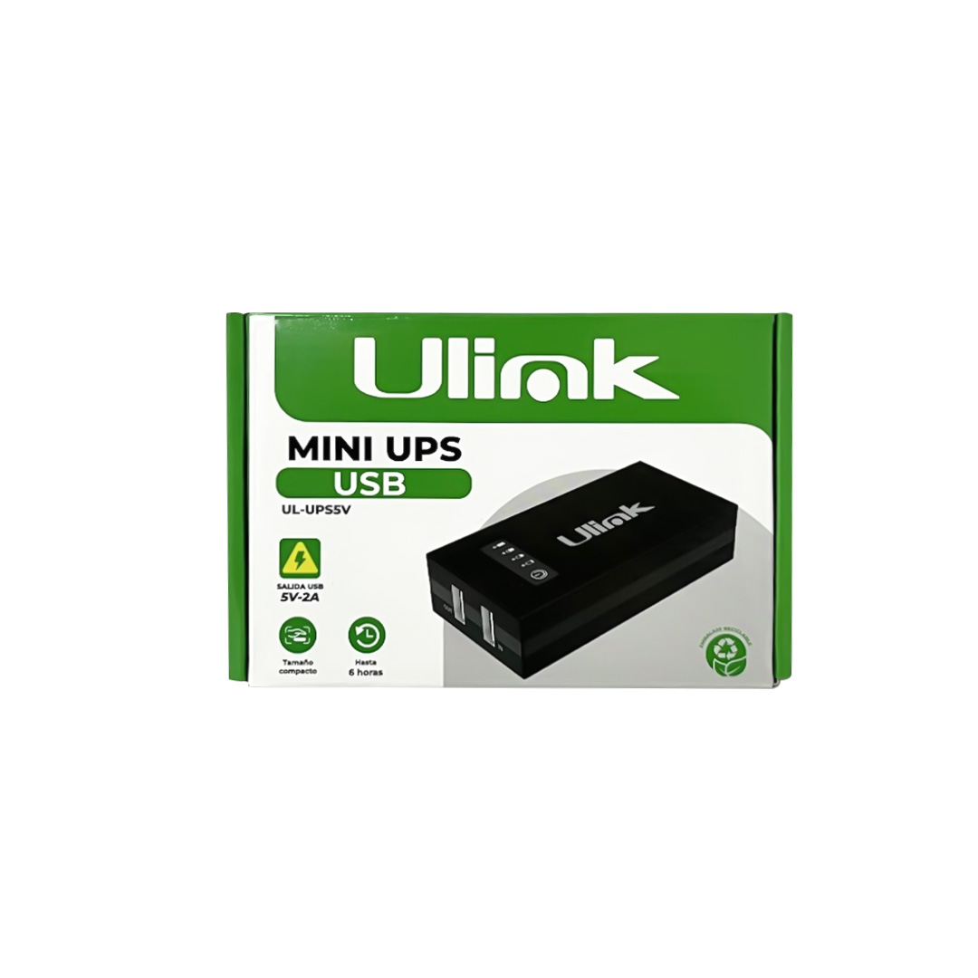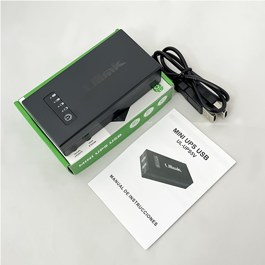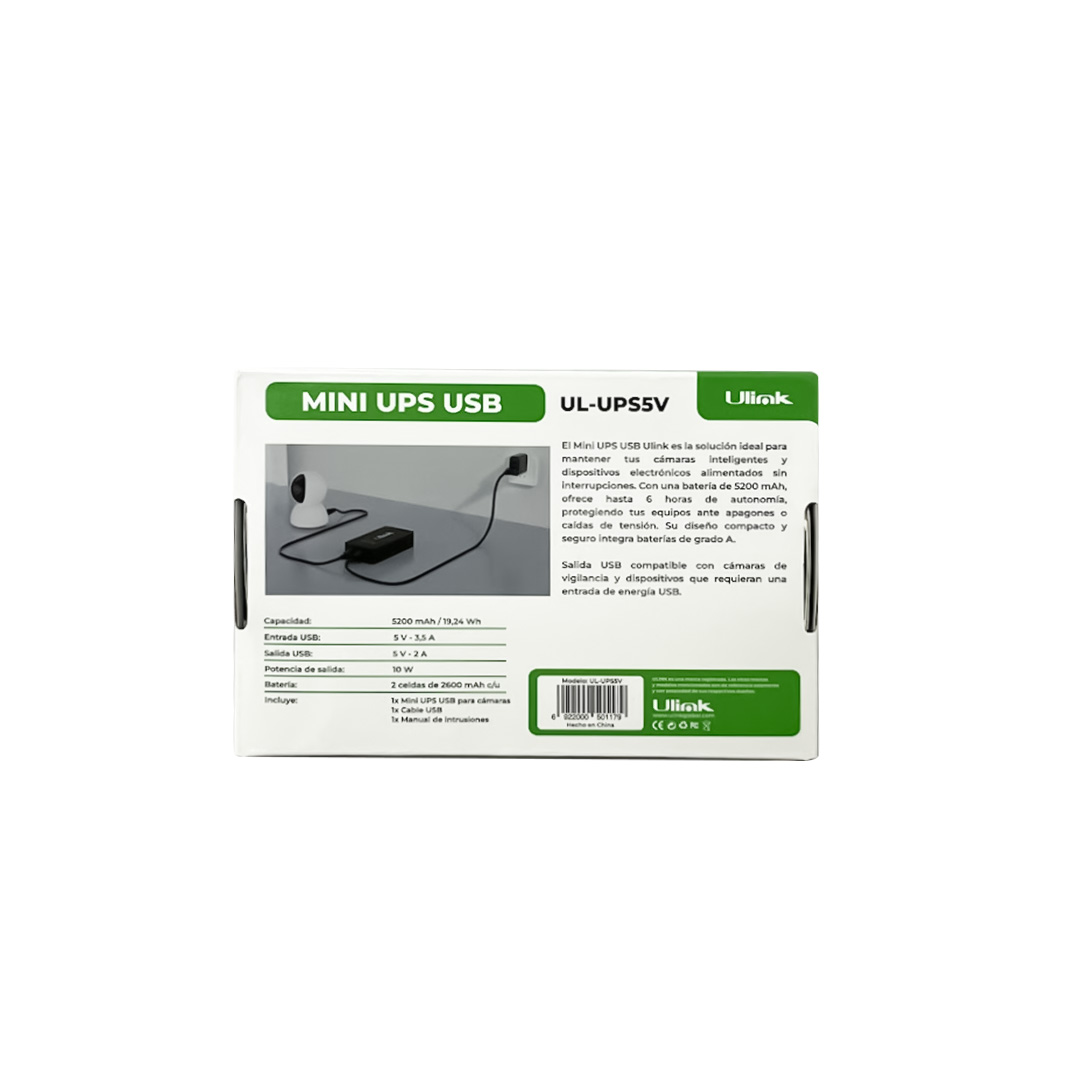 El Mini UPS USB Ulink UL-UPS5V es una fuente de energía ininterrumpida diseñada para mantener cámaras inteligentes y dispositivos electrónicos USB funcionando durante cortes de energía o interrupciones eléctricas.